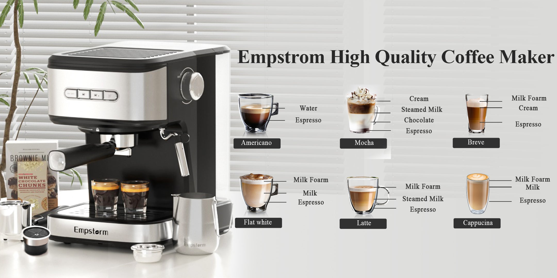 The 20-bar espresso machine Empstorm EM-01E is a versatile home coffee solution that makes a wide range of coffees, including americano, latte, cappuccino and macchiato. Feel the enjoyment of the ultimate espresso, with the perfect consistency from the 20-bar pressure espresso machine, releasing rich flavors and aromas.